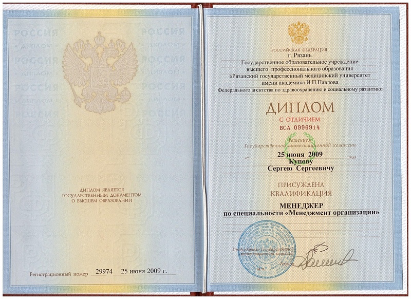 В 2009 году окончил с отличием факультет менеджмента ГОУ ВПО «Рязанский государственный медицинский университет имени академика И. П. Павлова» по специальности: «менеджмент организации».