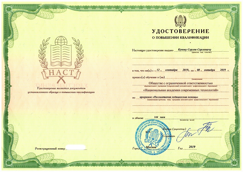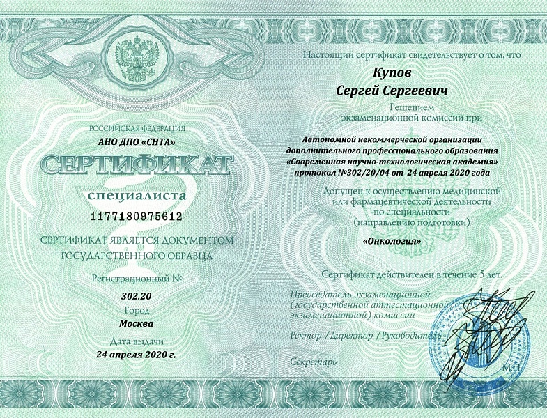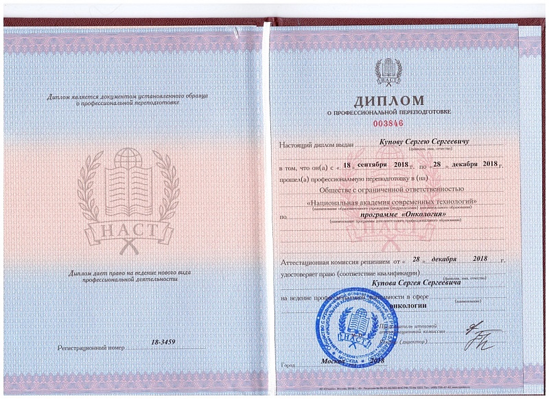 В 2018 году профессиональная переподготовка по специальности «онкология».