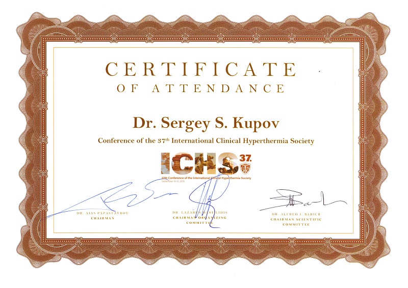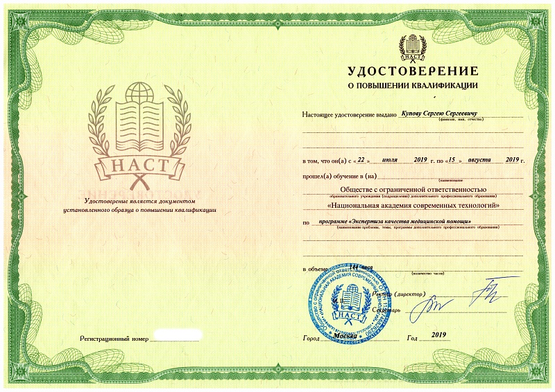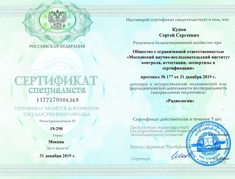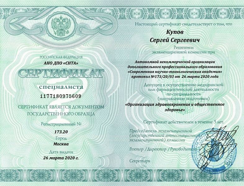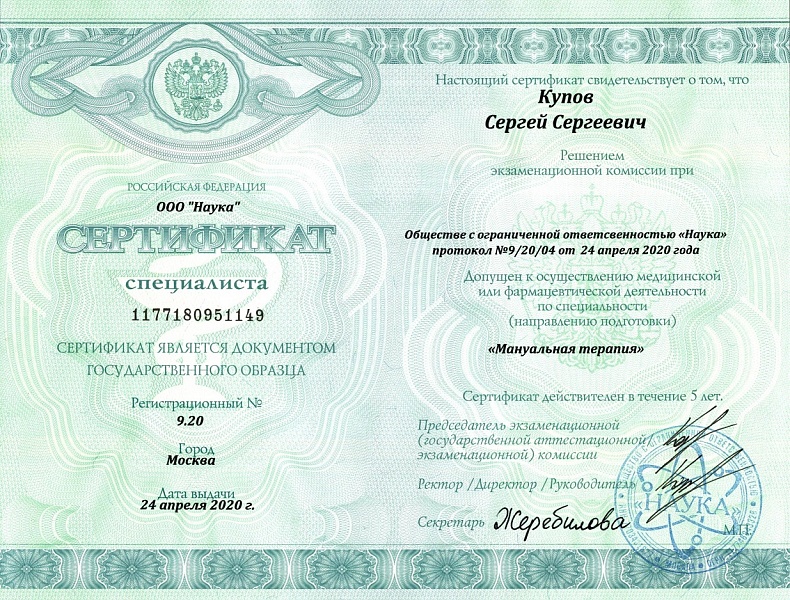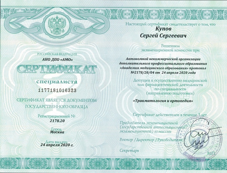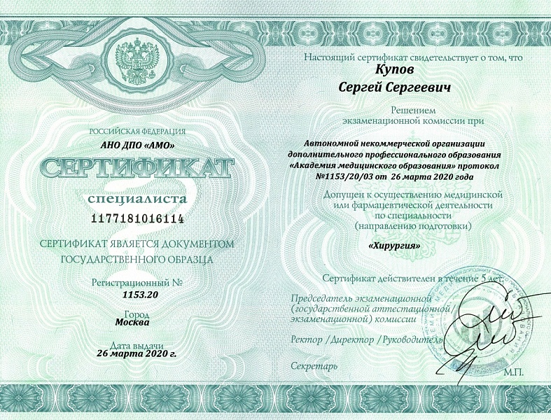Имею действующие сертификаты по специальностям: «онкология», «травматология и ортопедия», «хирургия», «мануальная терапия», «организация общественного здоровья и здравоохранения».