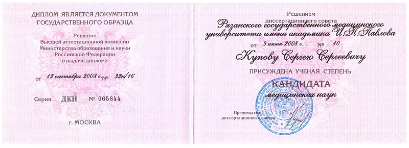 В 2008 году успешно защитил диссертацию на соискание учёной степени кандидата медицинских наук по специальностям: «травматология и ортопедия», «хирургия».